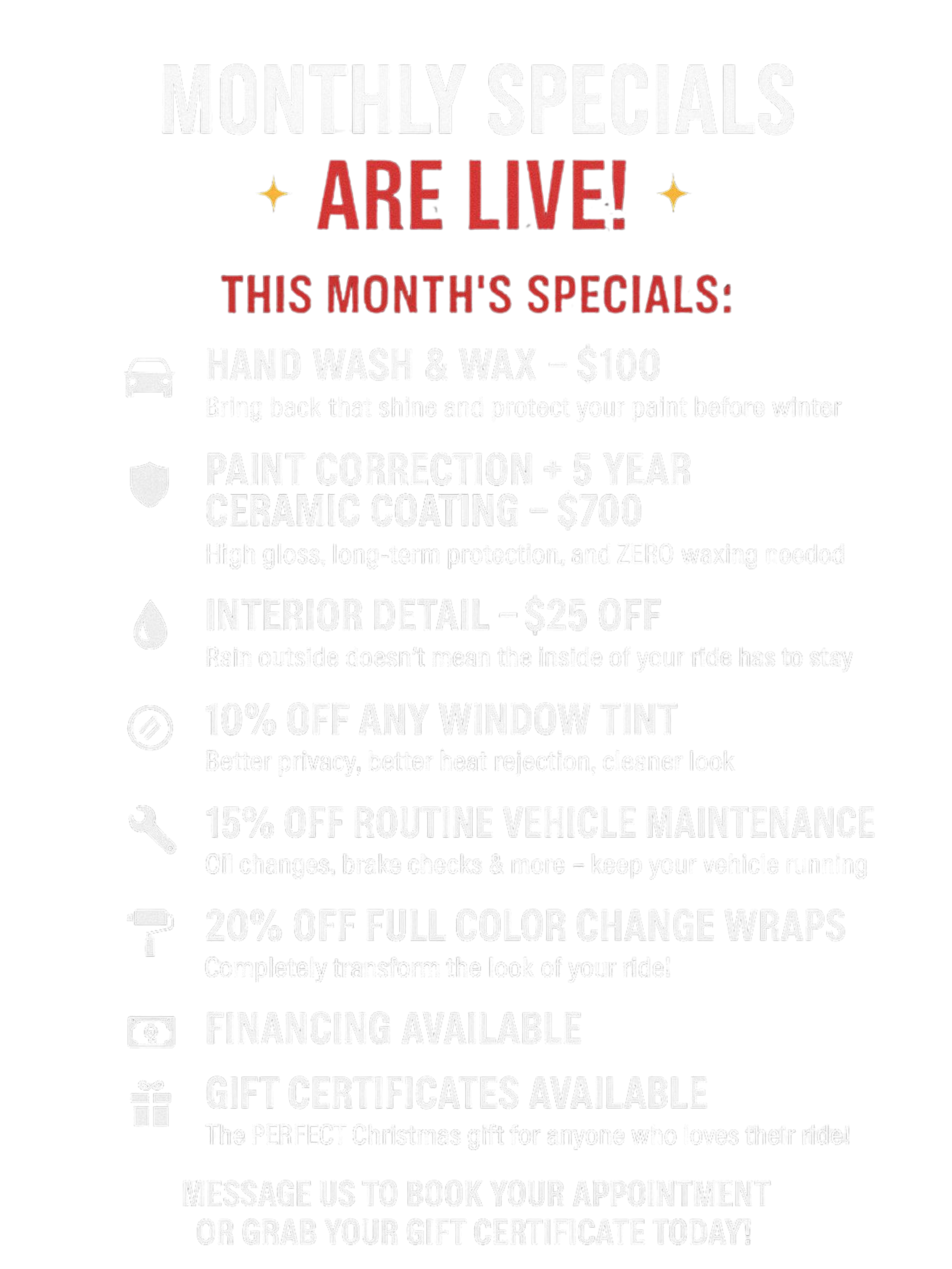 We started our journey five years ago with a single mobile detailing unit and a goal to bring top-quality car care directly to our customers. As our reputation grew, we expanded into a full-service shop and partnered with trusted experts to offer professional vinyl wraps and window tinting. Today, we’re proud to provide complete vehicle care solutions—including maintenance services and financing options—so every customer can enjoy a clean, protected, and customized ride.